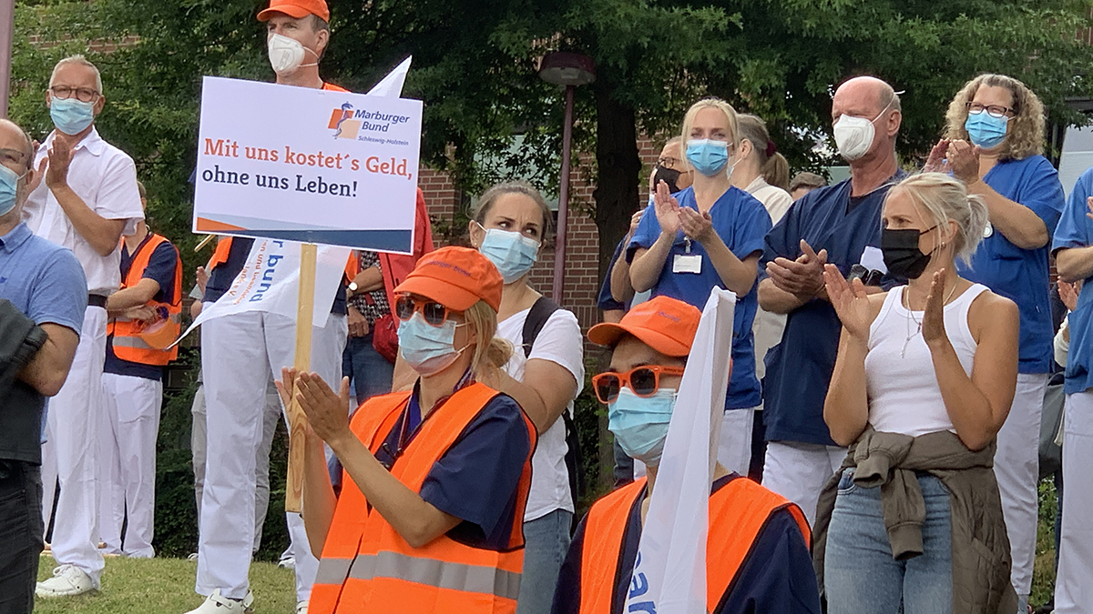 „Wir sehen keine Rechtfertigung dafür, Beschäftigte zu entlassen, die für das Funktionieren der Krankenhäuser in Rendsburg und Eckernförde unentbehrlich sind. Es ist untragbar, dass Menschen, die zu einer qualitativ hochwertigen Patientenversorgung beitragen, ihren Arbeitsplatz verlieren sollen, nur um Kosten einzusparen. Krankenhäuser sind Einrichtungen der öffentlichen Daseinsvorsorge und eine gesicherte flächendeckende Gesundheitsversorgung ist eine staatliche Pflicht. Es kann nicht sein, dass Ärztinnen und Ärzte, die Pflege und andere Gesundheitsberufe einem fortwährenden kommerziellen Rechtfertigungsdruck ausgesetzt sind“, betonte der schleswig-holsteinische Marburger Bund Vorsitzender Michael Wessendorf unter Beifall der Teilnehmerinnen und Teilnehmer.