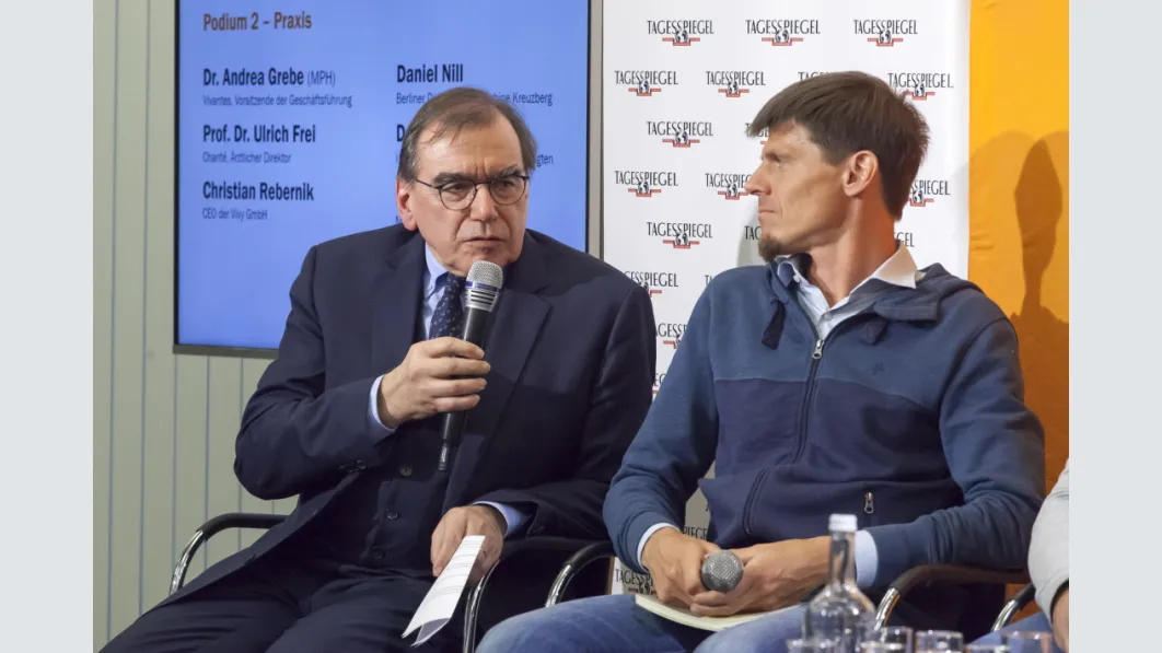 120 Gäste kamen und verfolgten 2,5 Stunden die kontroverse Diskussion. Das Intro zum Thema hielt PD Dr. Peter Bobbert, unser Landesvorsitzender. Auf den zwei Podien saßen sowohl Vertreter der Politik, u.a. Catherina Pieroth, gesundheitspolitische Sprecherin der Grünen, der Berliner Wissenschaftsstaatssekretär Steffen Krach und der Vertreter der BMG, Christian Klose, aus der Anwenderparxis, der Ärztliche Direktor der Charité, Prof. Ulrich Frei und die Vorsitzende der Geschäftsführung von Vivantes, Dr. Andrea Grebe, aber auch Datenschützer, IT-Anbieter und Patientenvertreter.