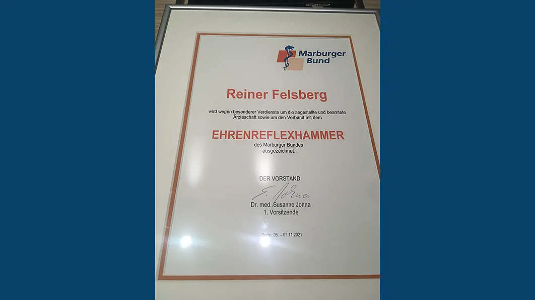 Reiner Felsberg übergibt zum 31.12.2021 die Geschäftsführung des Landesverbandes Berlin / Brandenburg an Stefan Pohlmann. 11 Jahre war er Geschäftsführer unseres Verbandes. Am 27.10.2021 haben wir ihm für seine Arbeit, sein Engagement und seine Verdienste Dank gesagt. Hierfür kamen zahlreiche Gäste, Freund:innen, Mitarbeiter:innen und Kolleg:innen der vergangenen Jahre im großen Hörsaal des Langenbeck Virchow Hauses zusammen. Ministerin Ursula Nonnenmacher, Staatssekretär Martin Matz, die Vorstände von Charité, Bündnisgrüner Fraktion, der BÄK und des Weltärztebundesund und viele mehr verabschiedeten Reiner Felsberg zusammen mit dem Vorstand, den Delegierten und weiteren Mitgliedern des MB Landesverbandes. Mehr erfahren