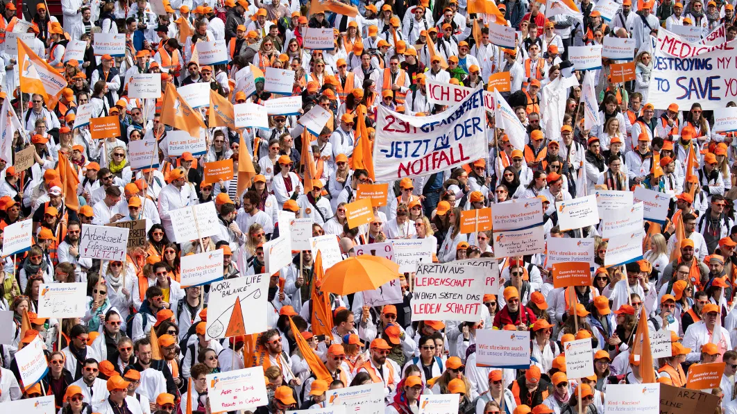 In Tarifverhandlungen muss der Marburger Bund eher selten zum Arbeitskampf aufrufen. Lange Jahre sind keine Streiks notwendig. Erst im Frühjahr 2019 ruft der MB an kommunalen Kliniken zu Warnstreiks auf. Den Auftakt macht am 10. April eine zentrale Kundgebung auf dem Römerberg in Frankfurt/M., wo sich mehr als 5.000 Ärztinnen und Ärzte versammeln. In der fünften Verhandlungsrunde gelingt schließlich der Durchbruch: Der Marburger Bund einigt sich mit der Vereinigung der kommunalen Arbeitgeberverbände am 22. Mai 2019 auf einen wegweisenden Tarifabschluss: Der Einstieg in eine bessere Arbeitszeitgestaltung ist geschafft, die Arbeitsbelastung wird durch neue Obergrenzen bei den Bereitschaftsdiensten reduziert. Der Anspruch auf mindestens zwei arbeitsfreie Wochenenden im Monat ist tarifvertraglich geregelt. Die Erfassung der Arbeitszeit muss elektronisch oder auf andere Art mit gleicher Genauigkeit erfolgen. Dabei gilt die gesamte Anwesenheitszeit der Ärztinnen und Ärzte als Arbeitszeit.