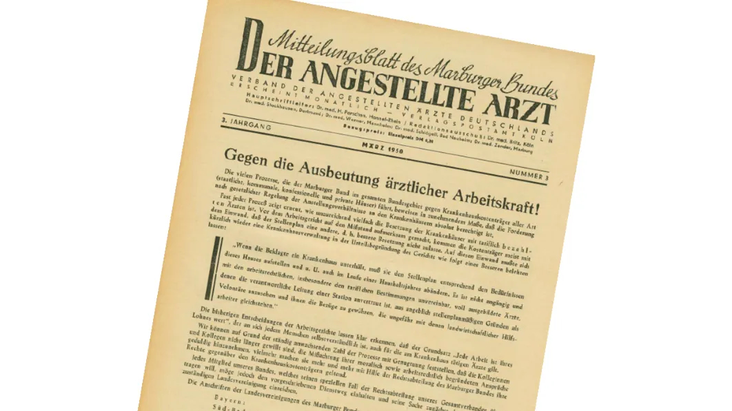 Ganz am Anfang stehen die unzumutbaren Arbeitsbedingungen für junge Ärzte (m/w/d) und ihre materielle Not. Viele arbeiten als „Volontärärzte“ oder „Gastärzte“ und erhalten meist nur ein Taschengeld oder lediglich Verpflegung. Der Unmut gärt. Nach vielen informellen Kontakten treffen sich Mitte Juni 1947 erstmals Jungärzte und Medizinstudenten in Marburg – es ist die Geburtsstunde des heutigen Verbandes angestellter Ärztinnen und Ärzte. Für die Initiatoren steht fest, dass sie einen selbstständigen Verband brauchen, der ihre wirtschaftlichen und gewerkschaftlichen Interessen wahrnimmt. Nach weiteren Treffen nimmt der Marburger Bund Gestalt an. Der Bundesverband hat fortan seinen Sitz in Köln.