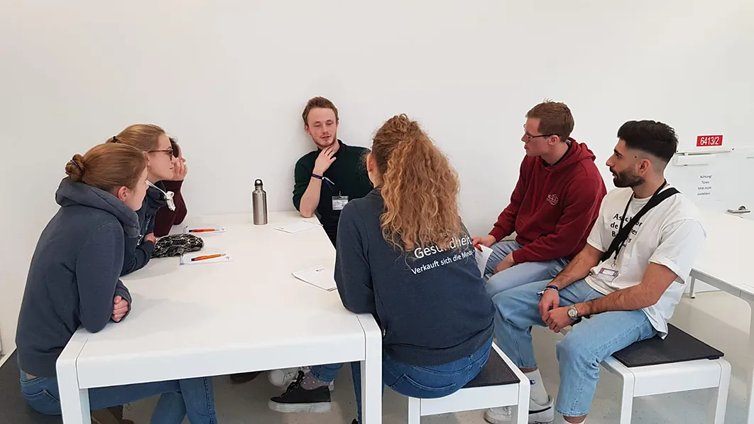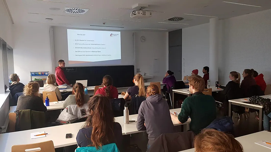 Im Workshop „Ärztliche Berufspolitik hautnah“ warb Philipp Schiller für politisches Engagement im Marburger Bund bereits während des Studiums und diskutierte gemeinsam mit seinen Kommilitonen studienrelevante politische Probleme. Besonders im Fokus stand dabei das PJ, namentlich die mangelnde Mobilität im Praktischen Jahr sowie die deutlich zu niedrigen Aufwandsentschädigungen. Außerdem wurde über die vielerorts als willkürlich empfundenen Entscheidungspraktiken der einzelnen Landesprüfungsämter gesprochen. Damit wurden die Perspektiven, wo und wie man sich nach dem Studium weiterhin politisch engagieren kann, schnell deutlich.