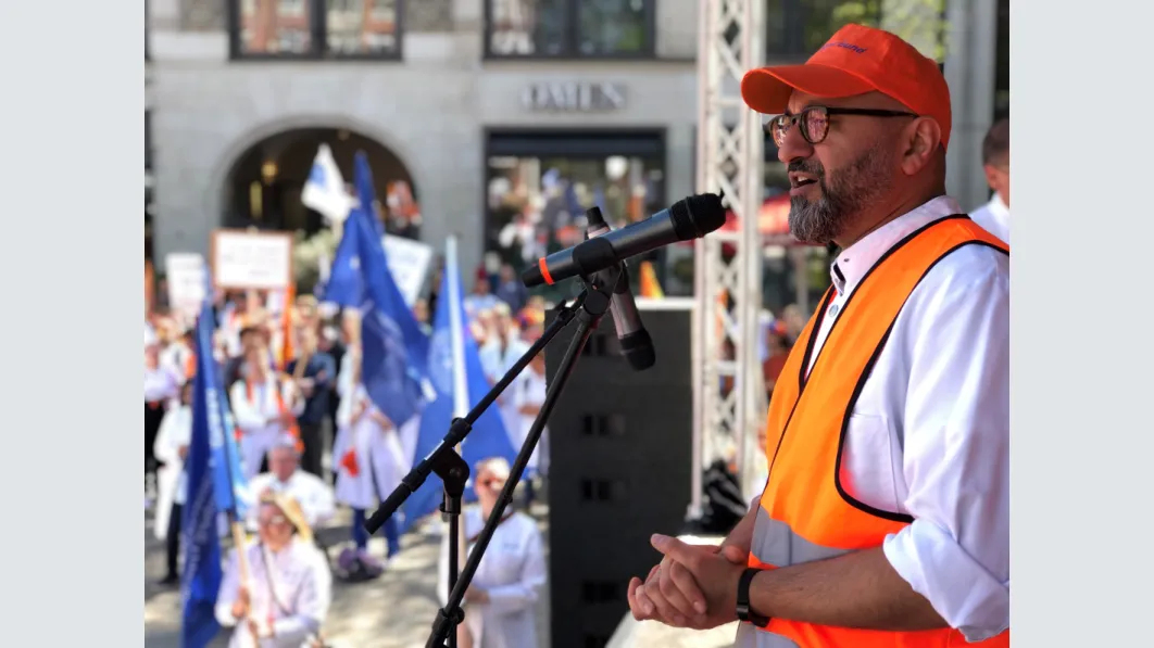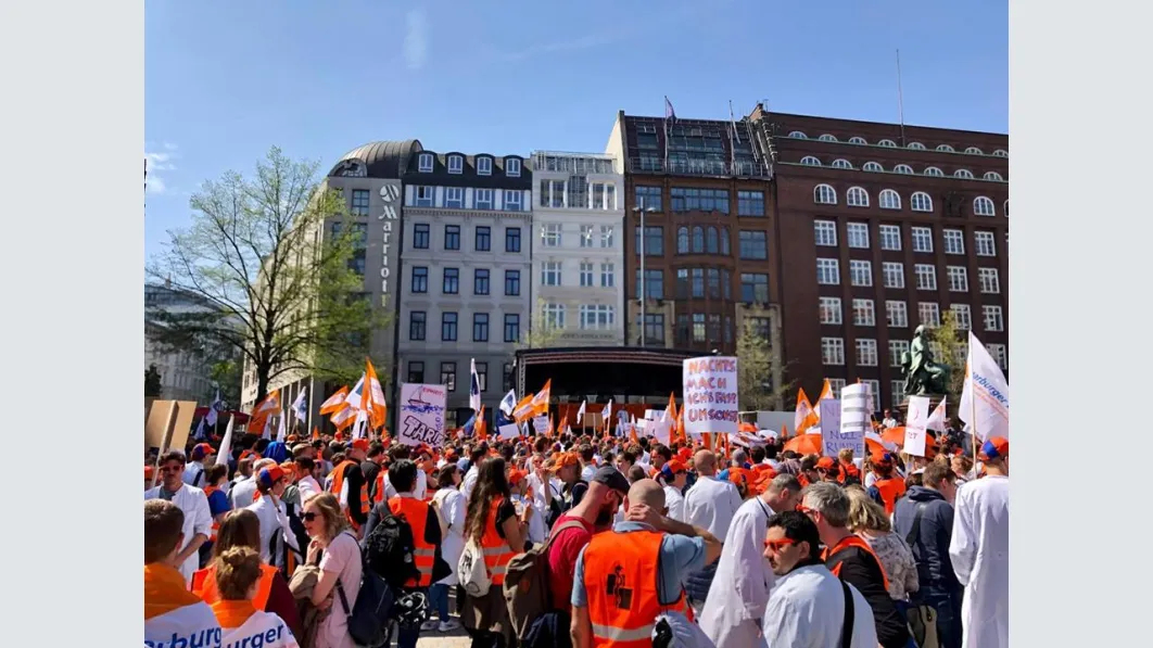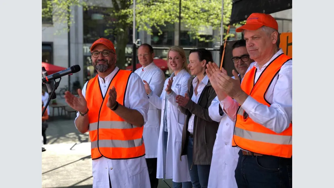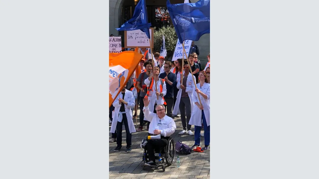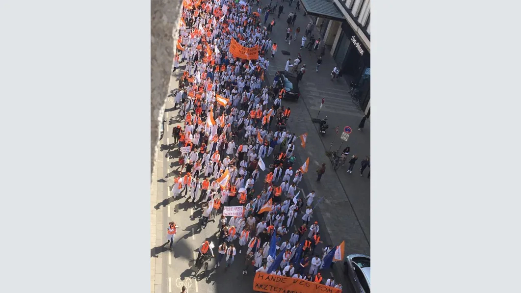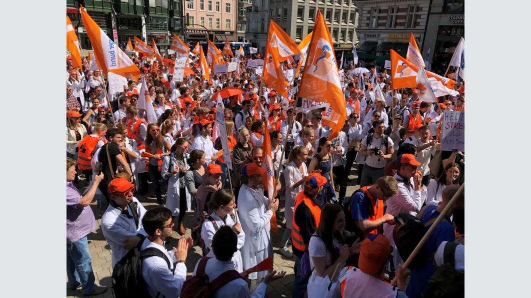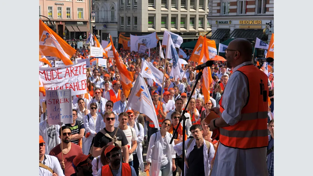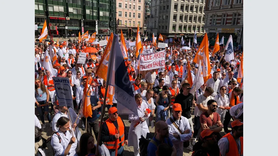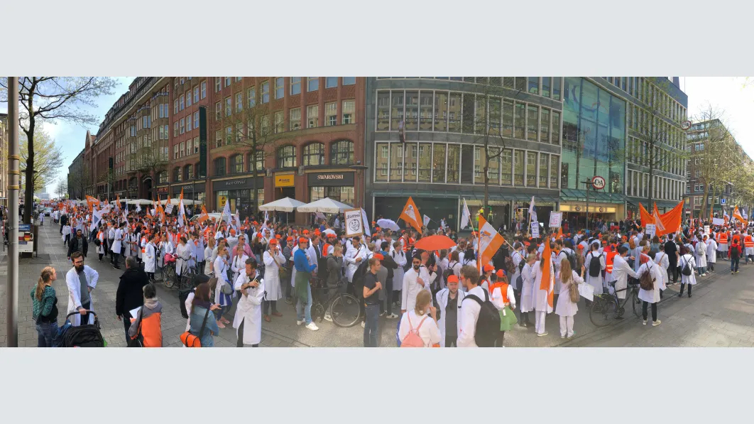 Trotz der kurzen Vorlauffrist eine überwältigende Beteiligung an dem Warnstreik und der Demonstration in Hamburg: Nach vorsichtigen Schätzungen der Polizei waren es rund 2.000 Ärztinnen und Ärzte, die am Mittwoch zusammenkamen, um ihre Forderungen nach Tarifsicherung und einer angemessenen Bezahlung zu untermauern und ihrer Gewerkschaft den Rücken zu stärken. Mit Transparenten und Demoschildern machten sie bei der Auftaktkundgebung in St. Georg auf ihre Forderungen aufmerksam, zogen anschließend durch die Innenstadt und kamen zur Abschlusskundgebung auf dem Gänsemarkt zusammen. „Das Wichtigste für uns ist, dass der Ärztetarifvertrag für uns bestehen bleibt, dass wir nach wie vor als Ärzte für Ärzte verhandeln dürfen“, sagte 1. Vorsitzende des Landesverbandes Hamburg, Dr. Pedram Emami, mit Blick auf die Tarifsicherung.