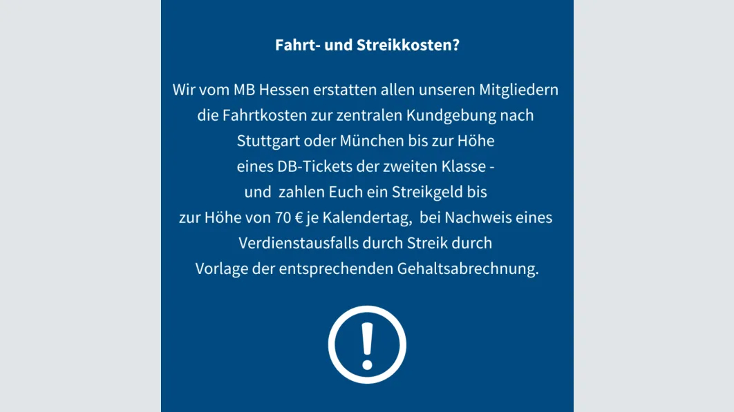 - Nicht alle Gewerkschaften zahlt erstattet seinen Mitgliedern die Fahrtkosten zur zentralen Kundgebung nach Stuttgart oder München bis zur Höhe eines DB-Tickets der zweiten Klasse, alternativ ist auch die gemeinsame Busanreise möglich (Kosten für Busse werden nach vorheriger Absprache mit der MB Geschäftsstelle übernommen).