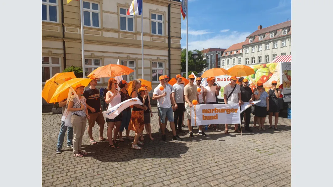 Nachdem die Arbeitgeberseite auch nach einem ersten Warnstreik Ende Mai kein verhandlungsfähiges Angebot vorgelegt hat, haben die Ärztinnen und Ärzte der Kreiskrankenhaus Demmin GmbH am 19.06.2019 erneut einen ganzen Tag gestreikt. Der Druck auf die Arbeitgeberseite konnte damit erhöht werden. Mehr als 25 Ärztinnen und Ärzte versammelten sich zu einer Kundgebung auf dem Marktplatz in Demmin, um die berechtigte Forderung nach besseren Arbeits- und Vergütungsbedingungen lautstark zum Ausdruck zu bringen. Die Beteilung am Streik hat damit die Erwartungen übertroffen, denn im Kreiskrankenhaus Demmin sind ca. 40 Ärztinnen und Ärzte beschäftigt. Gemessen an der den Notdienst aufrechterhaltenden Kolleginnen und Kollegen haben sich also nahezu alle übrigen Ärztinnen und Ärzte an der Aktion beteiligt.