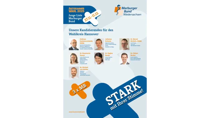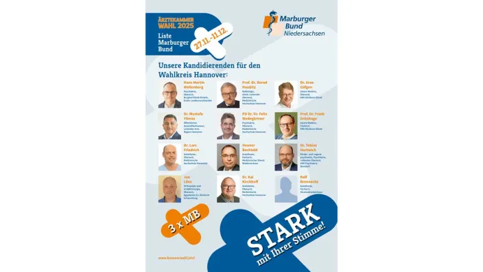 Hier stellen sich auf zwei Marburger-Bund-Listen 19 Kandidierende zur Wahl. Geben Sie Ihnen ab dem 27. November Ihre 3 Stimmen! Junge Liste Marburger Bund Liste Marburger Bund