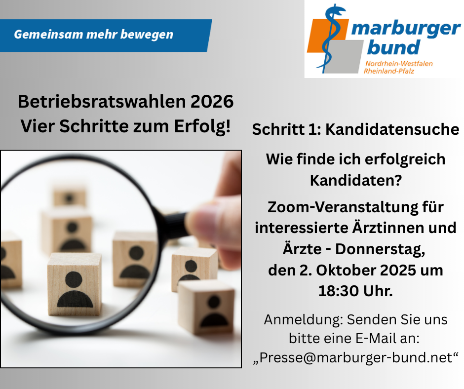 Sofern Sie noch nicht regelmäßig aus unserem Netzwerk „Mitbestimmung“ E-Mail-Nachrichten erhalten, senden Sie uns bitte eine E-Mail mit ihren Kontaktdaten und dem Namen ihrer Klinik an die folgende Adresse: „Presse@marburger-bund.net“.