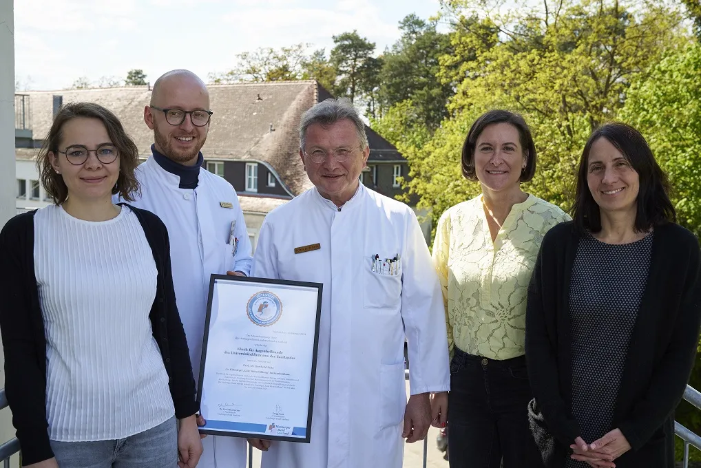 Über die Auszeichnung zeigte sich ebenso die Vorstandsvorsitzende und Ärztliche Direktorin des UKS Prof. Dr. Jennifer Diedler hocherfreut. Sie lobte die Initiative des Marburger Bundes und das Engagement der Klinik für Augenheilkunde: „Eine solide fachärztliche Weiterbildung ist uns am Universitätsklinikum des Saarlandes sehr wichtig.“ Die Klinik für Augenheilkunde ist nach der Klinik für Diagnostische und Interventionelle Radiologie und der Klinik für Anästhesiologie, Intensivmedizin und Schmerztherapie bereits die dritte derart ausgezeichnete Fachklinik am UKS. „Es ist wunderbar, dass die Augenklinik dieses Siegel nun ebenfalls erhalten hat und wir am UKS in der Weiterbildung der Fachärztinnen und Fachärzte mit gutem Beispiel vorausgehen“, so Prof. Diedler.