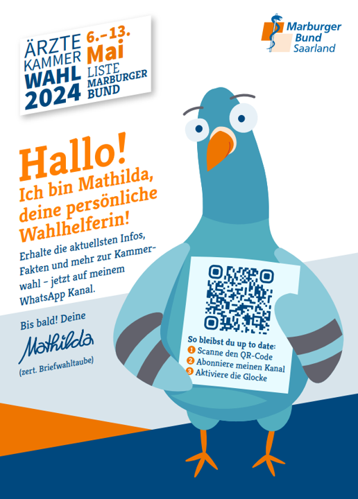Nach der Vorstellung der Kerninhalte wurde die Wahlkampagne präsentiert. Mit Mathilda, der Briefwahltaube, erhält der Wahlkampf seine wichtigste Unterstützerin und ein zentrales Leitmotiv. Mit ihrem eigens für die Kammerwahl eingerichteten WhatsApp-Kanal wird sie als Wahlmaskottchen regelmäßig über alles Wichtige zur Kammerwahl informieren, von Nachrichten über die Vorstellung der Wahlliste bis hin zu Veranstaltungen. Der Kanal kann über folgenden Link abonniert werden: https://whatsapp.com/channel/0029VaOUQHcAu3aJFLCi7225 oder über den QR-Code.