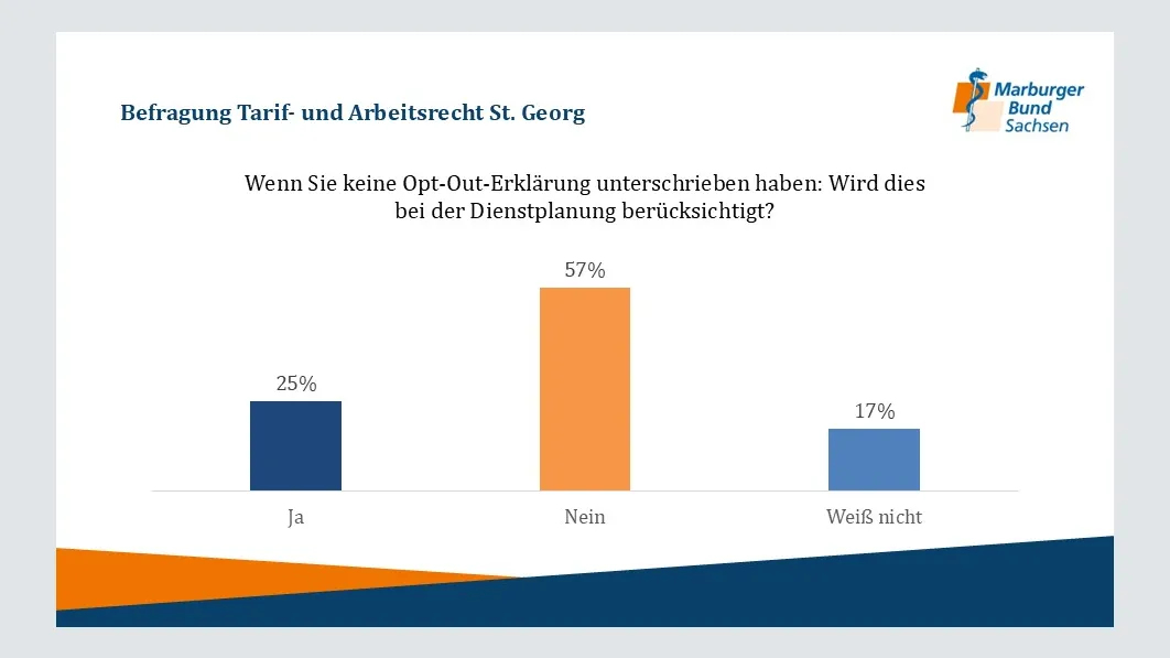 • Opt-Out-Regelung: Mehr als die Hälfte derjenigen Ärztinnen und Ärzte, die keine Opt-Out-Regelung unterschrieben haben und für die damit die gesetzlichen Arbeitszeitgrenzen gelten, gibt an, dass dies in der Dienstplanung nicht berücksichtigt wird. Eine solche Dienstplanung verstößt gegen geltendes Arbeitszeit- und Tarifrecht.