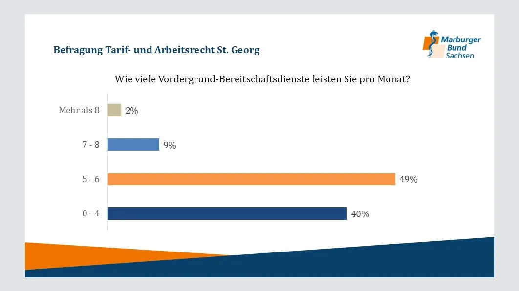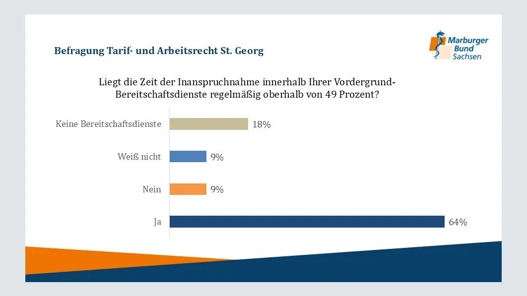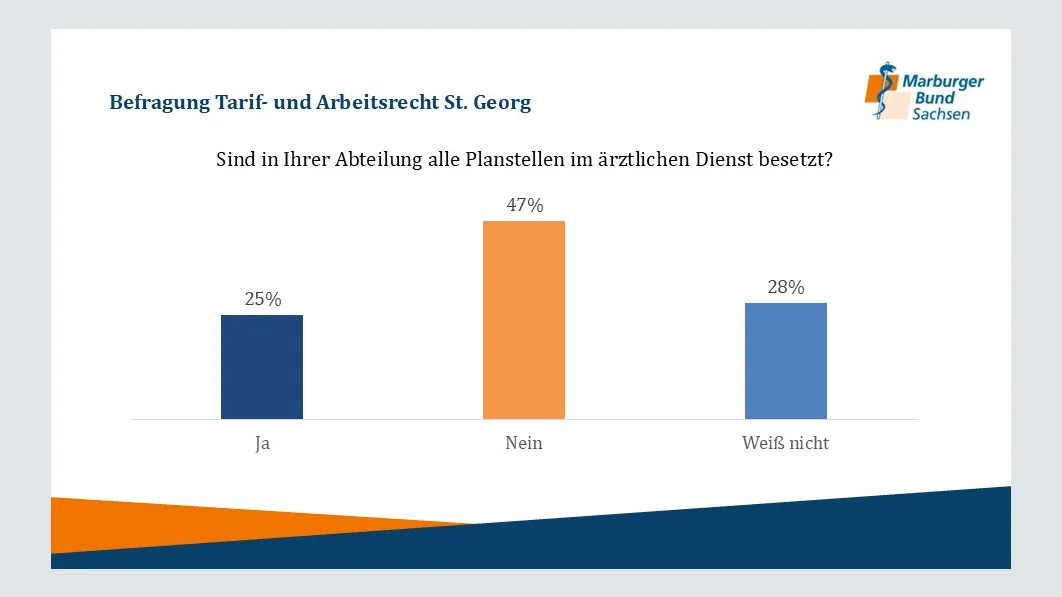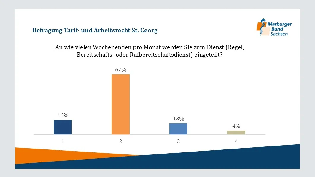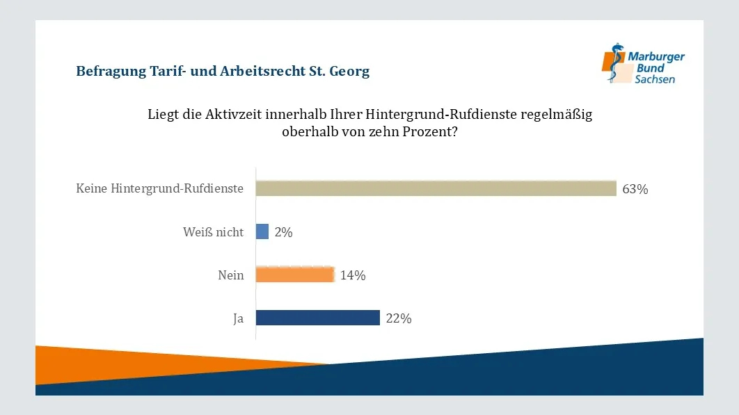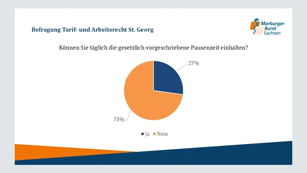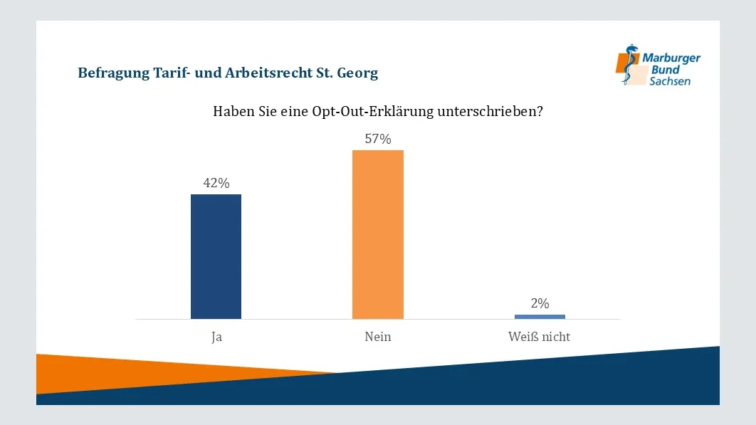 Im Juni 2024 führte der Marburger Bund Sachsen eine Umfrage unter den Ärztinnen und Ärzten des Klinikums St. Georg Leipzig durch, an der 195 Beschäftigte teilnahmen. Die Ergebnisse der Umfrage zeigen deutliche Herausforderungen und Defizite bei der Einhaltung tariflicher Arbeitsbedingungen. Hier einige Auszüge: